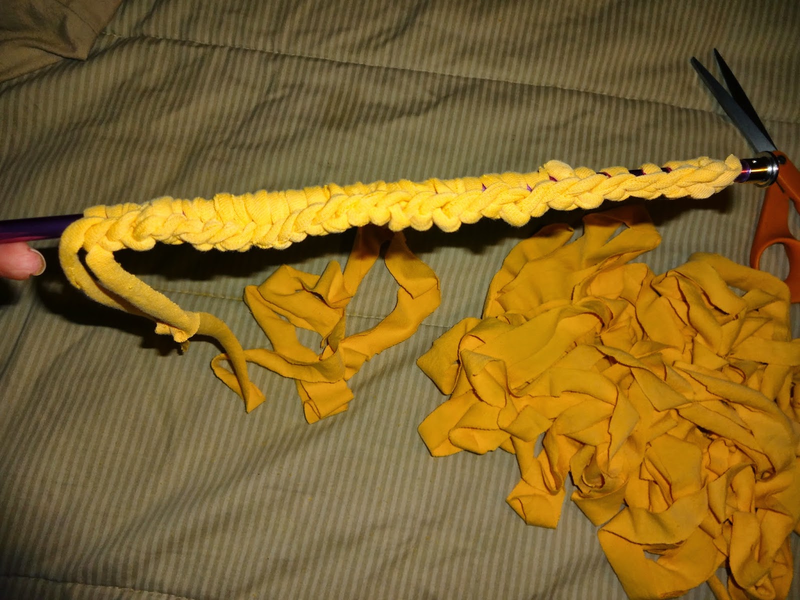 At any rate, to get started you need gather the shirts you need. To make this small mat I used three adult size large shirts. Cut them long-wise in one to two inch pieces, then cut one side so that it is now a long strip rather than a loop.